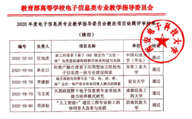 教育部高等学校电子信息类教学指导委员会为积极推进高等学校电子信息类一流本科专业建设,探索课程教学和实践育人的改革思路和实施路径,鼓励教师聚焦专业内涵式发展,于2020年批准95项教学改革项目立项。公司李建新教授获批一项题为《地方高校电信类专业“改、协、训、研、培”五位一体产学合作协同育人模式的探索》的教学改革项目。近日,教育部高等学校电子信息类教学指导委员会组织专家对2020年度获批的95项教学改革项目进行了评审,公司李建新教授主持的该教育部教指委教学改革研究项目顺利通过验收。该项目是公司首次获批教育部教学改革项目,项目研究成果对加强公司电子信息工程专业建设、提升人才培养质量具有重要的意义。